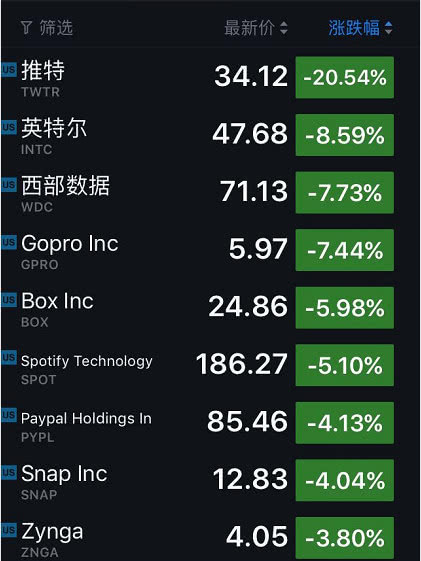 美国科技股也多数下跌,其中跌幅较大的公司包括:推特(跌20.54%)、英特尔(跌8.59%)、西部数据(跌7.73%)、GoPro(跌7.44%)、Box(跌5.98%)、Spotify(跌5.10%)、PayPal(跌4.13%)、Snap(跌4.04%)、Zynga(跌3.80%)、特斯拉(跌3.09%)、Square(跌2.97%)、伊士曼柯达(跌2.90%)、Adobe(跌2.72%)、黑莓(跌2.63%)、Alphabet(跌2.54%)、Roku(跌2.26%)、Dropbox(跌2.21%)、思科(跌2.21%)、Netflix(跌2.17%)、eBay(跌1.80%)、微软(跌1.77%)、苹果(跌1.66%)、高通(跌1.40%)、VMware(跌1.31%)、英伟达(跌1.11%)和IBM(跌1.06%)。