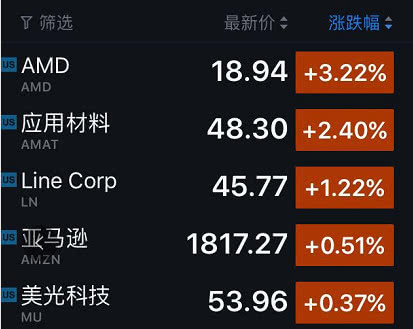 另一方面,涨幅较大的公司则包括:AMD(涨3.22%)、应用材料(涨2.40%)和Line(涨1.22%)。