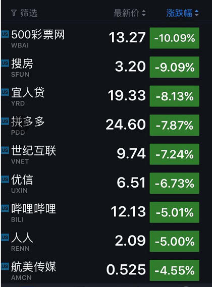 中国概念股多数下跌,其中跌幅较大的公司包括:500彩票网(跌10.09%)、搜房(跌9.09%)、宜人贷(跌8.13%)、拼多多(跌8.13%)、世纪互联(跌7.24%)、优信(跌6.73%)、哔哩哔哩(跌5.01%)、人人(跌5.00%)、航美传媒(跌4.55%)、猎豹移动(跌4.30%)、猎豹移动(跌4.30%)、好未来(跌4.10%)、搜狗(跌4.09%)、迅雷(跌3.59%)、宝尊电商(跌3.53%)、灿古(跌3.51%)、极光数据(跌3.41%)、聚美优品(跌3.29%)、寺库(跌3.09%)、圣盈信(跌2.96%)、搜狐(跌2.89%)、陌陌(跌2.88%)、拍拍贷(跌2.85%)、中通快递(跌2.81%)、途牛(跌2.81%)、爱奇艺(跌2.66%)、红黄蓝(跌2.65%)、中网载线(跌2.61%)、华米科技(跌2.56%)、阿里巴巴(跌2.45%)、凤凰新媒体(跌2.20%)、唯品会(跌2.18%)、研控科技(跌2.15%)、百度(跌2.02%)、无忧英语(跌1.98%)、欢聚时代(跌1.93%)、58同城(跌1.75%)、前程无忧(跌1.73%)、和信贷(跌1.48%)、百世集团(跌1.36%)、携程网(跌1.20%)、第九城市(跌1.19%)、京东(跌1.17%)、融360(跌1.10%)、微博(跌1.08%)和网易(跌1.02%)。