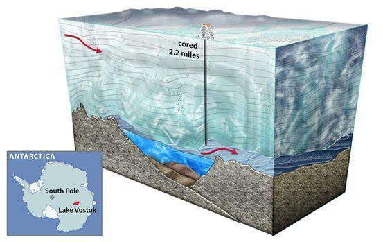 位于南极冰盖4公里左右深处的沃斯托克冰下湖。后来科学家们在这里打了钻 | 维基