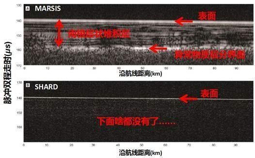 你或许会问,既然对火星探测了几十年,为啥之前的雷达观测都没有发现液态水呢?确实,除了火星快车号携带了探地雷达MARSIS,火星勘测轨道飞行器(MRO)也携带过一个探地雷达SHARAD,而且…SHARAD也探测过这个区域。