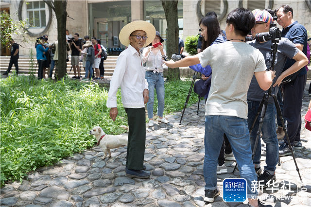 ↑记者们在云南丽江玉龙纳西族自治县石鼓镇“长江第一湾”的江边柳林采访一位植树老人(7月20日摄)。新华社记者 金立旺摄