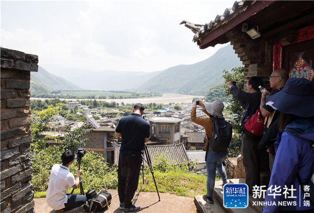 ↑记者们在云南丽江玉龙纳西族自治县石鼓镇拍摄“长江第一湾”(7月20日摄)。新华社记者 金立旺摄