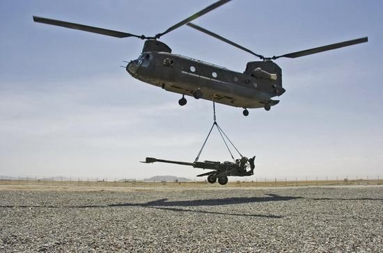 CH-47直升机吊运M777榴弹炮。