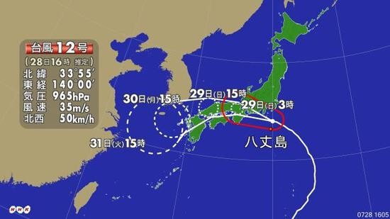 台风“云雀”从太平洋自东南向西北方向移动,最大瞬间风速达到50米/秒,预计台风通过地区在24小时内最大降雨量可能达到400毫米。截至当地时间17时,日本千叶县和静冈县部分地区已进入“云雀”的暴风区,预计台风将于28日深夜至次日黎明前登陆。在其转向西部移动之后,将侵袭7月初曾遭受暴雨袭击致超过二百人死亡的近畿地区。