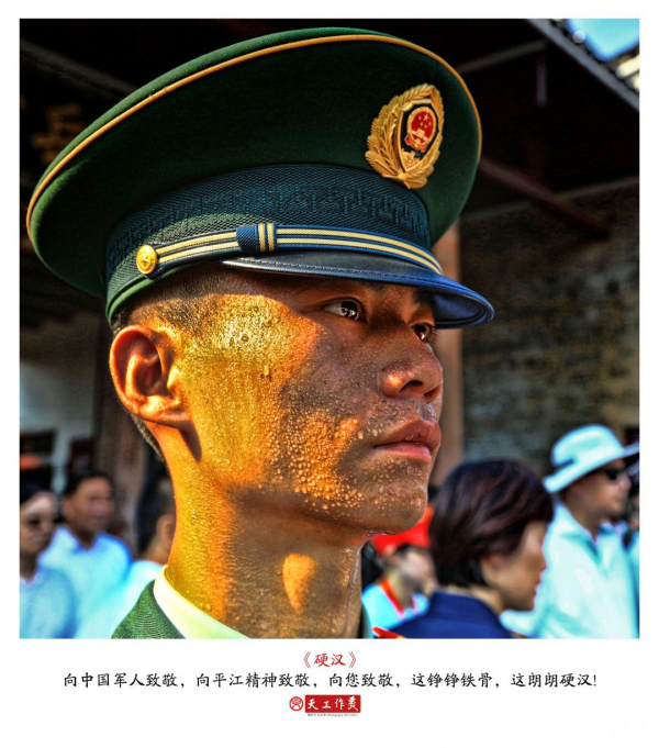 正如图片说明文中写的那样:一名军人在烈日下站岗,任凭高温炙热,汗如雨下,目光如炬,纹丝不动,向中国军人致敬,向平江精神致敬,向您致敬,这铮铮铁骨,这朗朗硬汉!