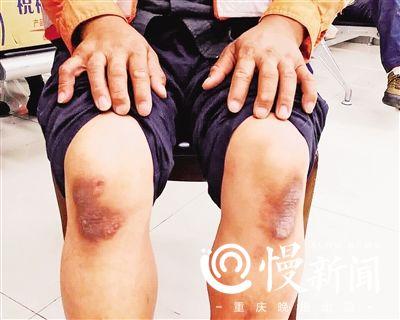 ▲跪在滚烫的地上作业是常事,有的工人膝盖“烫”出了茧疤。