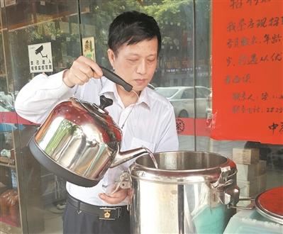 广州日报肇庆讯 (全媒体记者于敢勇摄影报道)进入夏季,炎热天气让人口干舌燥,这时能有一杯清茶解渴,是再惬意不过的事情了。在肇庆端州城区,有一个热心的茶叶老板邱卫东,在自己的商铺门口,12年来免费为过往的清洁工、群众、中小学生提供热茶。他每天要烧三保温桶茶水,不图名利,受到群众的广泛赞扬。