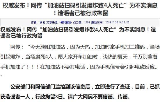 近期,一则内容为“濮阳加油站,发生爆炸4人死亡”的信息在微信朋友圈中大量传播。消息称,“濮阳加油站,因为天热,加油时拿手机扫二维码,当场引起爆炸,当场崩死4人,愿大家开车加油时,炎热的夏天,千万别拿着手机加油啦!!!”