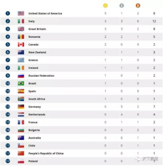 至此,为期5天的2018年世界赛艇U23锦标赛落下帷幕,22个项目比赛,美国队拿到5金1银2铜,位列奖牌榜第一。意大利队3金3银6铜排名第二,英国队3金3银2铜排名第三。中国队以1枚铜牌并列排在第17位。