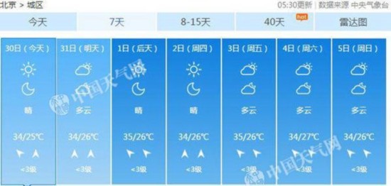 中国天气网讯 本周北京将继续“蒸桑拿”,预计今天(30日)最高温将达34℃,最小相对湿度为55%。近期北京气温高、湿度大,体感闷热,需注意防暑降温,多补充水分,同时日常生活中也需注意节水节电。