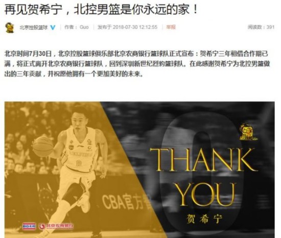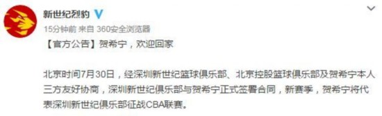 在深圳男篮召回贺希宁后,北控队也在球队社交媒体官方账号上发布了题为《再见贺希宁,北控男篮是你永远的家!》的告别信,信中球队感谢了贺希宁三年来的贡献,并称“纵使有再多的遗憾与不舍,本着契约精神还是决定将一手培养起来的孩子送回深圳”。