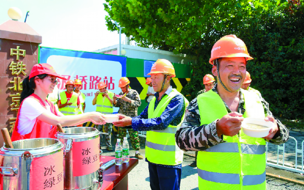 7月13日,合肥市庐阳经济开发区天河社区组织党员志愿者给地铁5号线建筑工人送去了西瓜和绿豆汤。当日,合肥市气象台发布高温黄色预警,当地最高气温达35℃。 通讯员 赵明 摄 来源:安徽日报