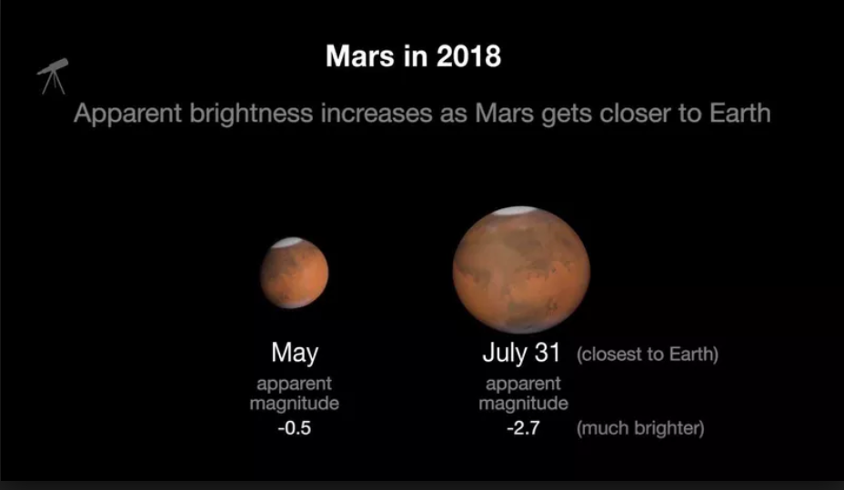 国外天文学家的这张模拟图上,今年5月,火星离地球距离还比较远,所以在夜空中的亮度只有-0.5等,今晚火星亮度可以达到-2.7等。