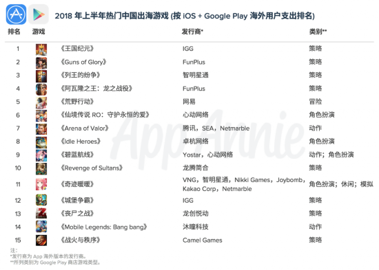 下图为2018 年上半年中国移动游戏海外收入排名前十五位榜单。IGG 的《王国纪元》凭借单款游戏收入位列榜首,旗下另一款《城堡争霸》位列十二;而 腾讯和FunPlus 均有两款游戏入榜。游戏类型方面,出海游戏仍以中重度为主,策略和RPG 游戏是吸金主力。