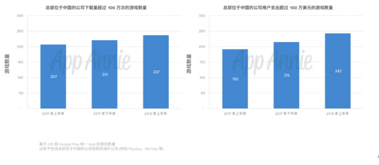 下图为中国移动游戏开发商在海外市场中下载量超过100 万次,以及用户支出超过100 万美元的游戏数量。截至2018 年上半年,分别超过200 款游戏突破了百万下载量和收入。此外,2018 年上半年,收入超过100 万美元的移动游戏也已经增至243 款。