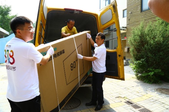 (7月31日上午,苏宁自创立以来售出的第15亿台大家电在京成交,苏宁零售集团副总裁范志军(右)与海信电器营销常务副总经理王伟(左)为用户送货上门。)