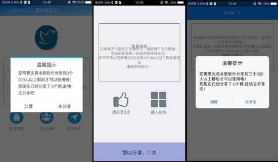 网络上流传一些以“请好心人转发”、“转发给身边需要的人”等为关键词的内容,大多数人看到后会点开浏览具体内容。这促使不法分子开发“诱导分享”类病毒,通过仿冒第三方工具名称、色情软件等诱导用户安装,用户必须分享到多个群聊才能正常使用软件,以此达到快速传播目的。