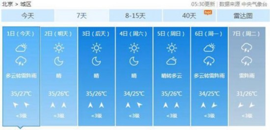 中国天气网讯 预计今天(8月1日)北京高温持续,夜有雷雨。6日前最高温都在34℃以上,闷热不减。之后副高南撤,受冷空气影响,7日将迎明显降雨,最高气温随之下降至31℃左右,届时目前这种高温闷热天气将得到一定缓解。