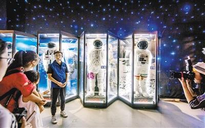 在返回舱的旁边,陈列着四套宇航服,“原来宇航服这么高呀!”一位应邀前去探馆的小朋友见到真的宇航服,惊讶极了。这四款宇航服分别为舱内宇航服、职业高空跳伞服、舱外宇航服和登月航天服,这些都是按照真正的宇航服1∶1仿制的,通过讲解员的讲述和自己的观察,刚才发出惊叹的小朋友不仅了解了四款宇航服的用途,还知道了它们的不同之处。
