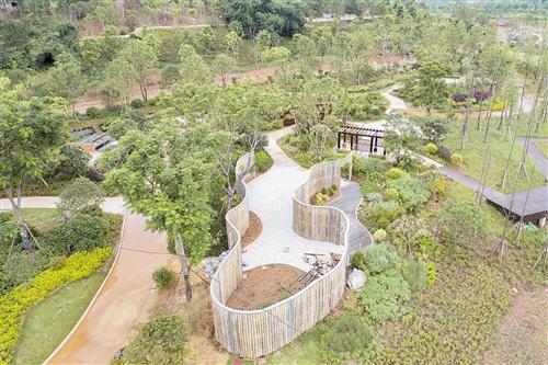 沿着健康之路来到玲珑岛的山顶看到,此处有一处“幸福花冠”,“花冠”犹如塔的造型。站在观光平台四周遥望整个园博园,美景尽收眼底。棕榈生态城镇发展股份有限公司技术负责人吴攸介绍,设置幸福花冠,用以体现广西瑶族文化与风情,将瑶族传统文化元素——凤凰羽毛抽象化融入景观当中,作为一处休憩与停留的重要景点,并结合精心的植物配置,营造出一种广西民族热情好客、团结友爱、邻里和睦的景观氛围。