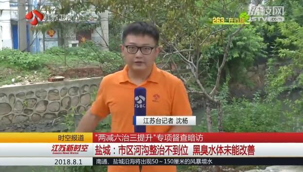 江苏台记者沈杨:“现在盐城市的室外温度是31度,空气湿度达到了74%,属于一个又热又闷的天气,在我身后的这个小水沟里面,水是自下而上地往外冒小水泡,臭气也是一阵接一阵。”