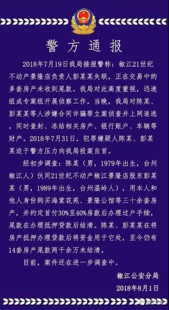 微信公众号“椒江公安”8月1日消息,浙江台州椒江公安分局8月1日通报了知名房产中介台州加盟店老板设局卷款跑路案调查进展。通报称,涉案两名犯罪嫌疑人已向警方自首,至今仍有14套房产多达两千余万元尾款未结清。