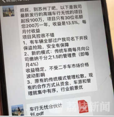 这些所谓的项目是否真实存在?鑫宜富公司员工小赵说,公司的投资涉及智慧停车场、餐饮配送、光伏、私人订制等行业。他们曾邀请过一些投资人到项目实地查看。这点也得到了投资人汪先生的证实。“前期我大概投了20万,买了一个项目,也去他们的实地企业参观了解过,都很正常。他们还有一个私人定制鞋的品牌项目,还在苏州美罗商场开有门店,我也去看了。”