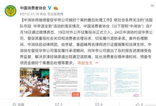 在中消协的微博下,华帝公司留言称,自2018年7月16日法国队夺冠,我司自凌晨即时启动退全款活动,始终恪守诚实信用原则,按照“法国队夺冠,华帝退全款”活动规则,切实做好每一位消费者的退款工作。截至7月31日24:00,已完成超过8成,华帝公司将不忘初心,继续切实做好本次退款工作。