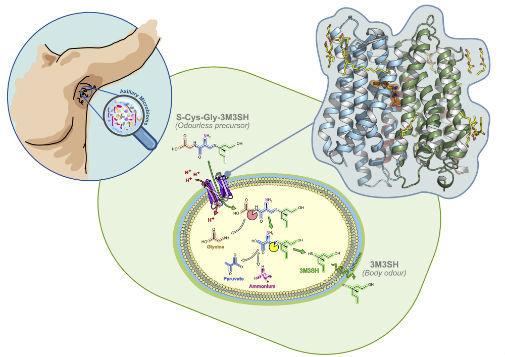 该团队最终揭秘了该过程的关键步骤——转运蛋白的结构。这种蛋白使细菌能够识别和消耗汗液化合物。理解这种蛋白质意味着,理论而言研究者可以开发某些新型的止汗剂来阻断这一过程。由于只有相对少量的细菌会产生最难闻的气味,研究者可以锁定这些细菌,把其他细菌划到目标范围之外。