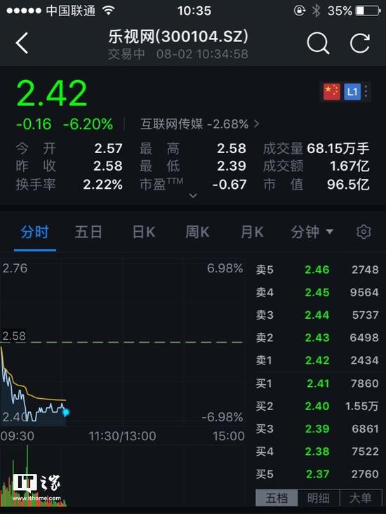 IT之家8月2日消息 乐视网股价周二早盘大跌约6.2%,报2.42元,总市值跌破百亿元,约96.5亿。至此,乐视网股价已较历史最高点下跌逾九成。乐视网近期持续走低,三季度股价已下跌超30%。