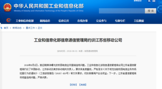 新浪科技讯 8月2日上午消息,据工信部网站消息,就近期媒体曝光的校园电信业务营销违规问题,工业和信息化部信息通信管理局会同江苏省通信管理局约谈了中国移动、江苏移动及南京移动相关负责人,要求其高度重视,严格落实《关于规范当前校园电信业务市场经营行为的通知》等文件要求,切实保障用户合法权益。下一步,江苏省通信管理局将彻查违规问题,严肃问责。