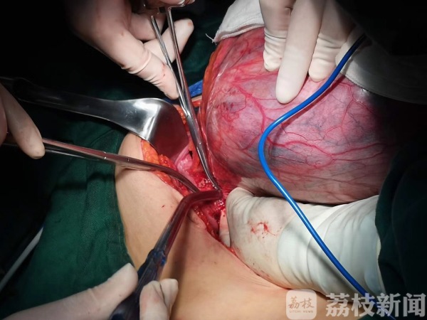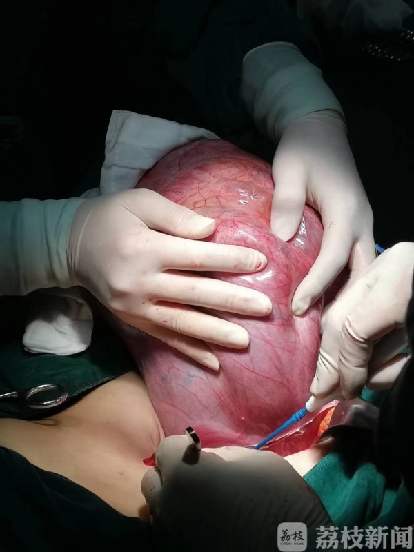 随即,甘女士来到淮安市第一人民医院,医生确诊甘女士腹部长了一个巨大的肿瘤,需要进行手术,而且手术难度较大。淮安市第一人民医院胃肠外科副主任医师赵耀称,手术难点在于肿块过于巨大,占据了几乎整个腹腔以及盆腔,并且肿瘤是实性肿瘤,术中极易出血,难以有空间和界限的操作,整个肿瘤已经侵犯膀胱、子宫,以及周围的脏器。