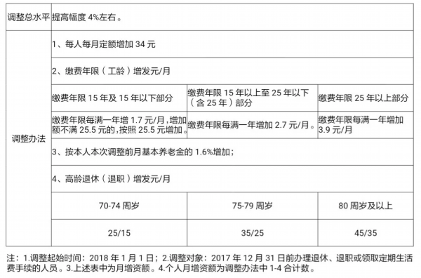 包括普遍调整和适当倾斜两部分:(一)普遍调整:一是退休、退职或领取定期生活费人员每人每月增加34元。二是退休、退职或领取定期生活费人员本人缴费年限(含视同缴费年限,不含折算缴费年限)15年及15年以下的部分,缴费年限每满1年(不满1年按1年计算),每月增加1.7元;本人缴费年限15年以上至25年以下(含25年)的部分,缴费年限每满1年,每月增加2.7元;本人缴费年限25年以上的部分,缴费年限每满1年,每月增加3.9元。按缴费年限月增加额不足25.5元的,按25.5元增加。三是退休、退职或领取定期生活费人员按本次调整前本人基本养老金的1.6%增加。计算额见分进角。