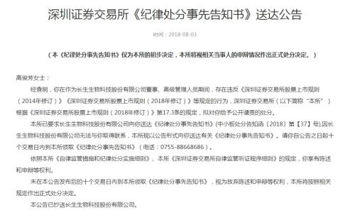中新网8月3日电 据深交所网站消息,深交所今日向ST长生六名高管发布《纪律处分事先告知书》。据公告信息显示,收到《告知书》的六名高管分别为:高俊芳、张晶、蒋强华、赵志伟、张友奎、刘景晔,其中高俊芳、张晶为长生生物董事。