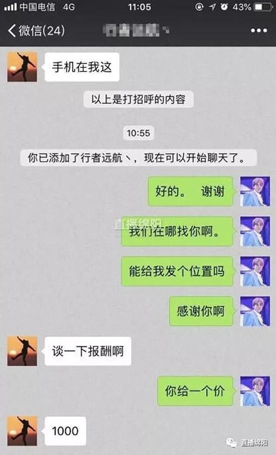 就在王强和家人准备重新购买手机的时候,突然收到了一条短信,来自一个陌生号码,短信内容只有两个字——“失主”。“这就是那个捡到手机的人,我当时就给他回拨过去,请问他能不能把手机还给我,我可以给一点报酬,然后他就让我加他的微信。”王强说。
