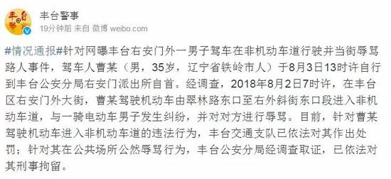 针对网曝丰台右安门外一男子驾车在非机动车道行驶并当街辱骂路人事件,驾车人曹某(男,35岁,辽宁省铁岭市人)于8月3日13时许自行到丰台公安分局右安门派出所自首。经调查,2018年8月2日7时许,在丰台区右安门外大街,曹某驾驶机动车由翠林路东口至右外斜街东口段进入非机动车道,与一骑电动车男子发生纠纷,并对对方进行辱骂。