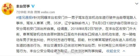 #情况通报#针对网曝丰台右安门外一男子驾车在非机动车道行驶并当街辱骂路人事件,驾车人曹某(男,35岁,辽宁省铁岭市人)于8月3日13时许自行到丰台公安分局右安门派出所自首。经调查,2018年8月2日7时许,在丰台区右安门外大街,曹某驾驶机动车由翠林路东口至右外斜街东口段进入非机动车道,与一骑电动车男子发生纠纷,并对对方进行辱骂。目前,针对曹某驾驶机动车进入非机动车道的违法行为,丰台交通支队已依法对其作出处罚;针对其在公共场所公然辱骂行为,丰台公安分局经调查取证,已依法对其刑事拘留。