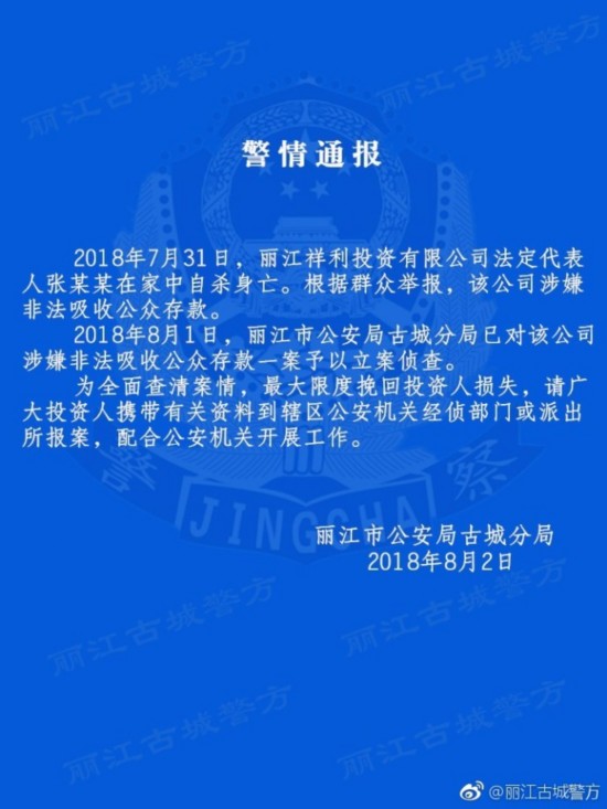 中新网8月3日电 据云南省丽江市公安局古城分局官方微博消息,丽江古城分局3日发布警情通报,2018年7月31日,丽江祥利投资有限公司法定代表人张某某在家中自杀身亡。