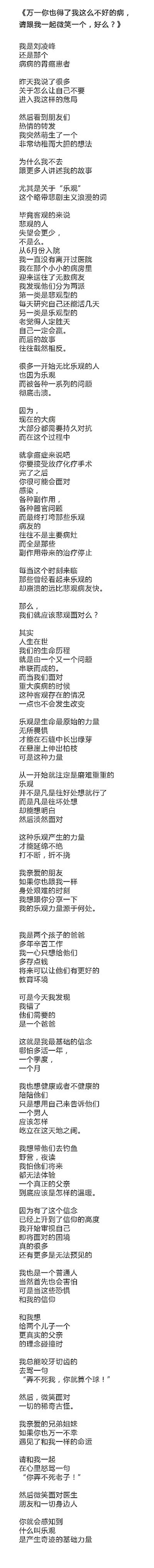 第二天,刘凌峰又发了一条长文章《万一你也得了我这么不好的病,请跟我一起微笑一个,好么?》。他说,乐观是生命中最原始的力量。