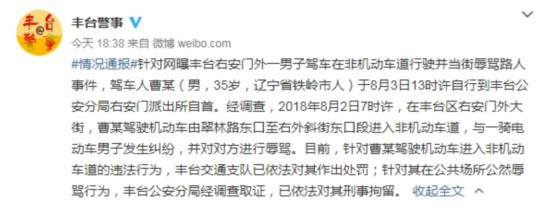经调查,2018年8月2日7时许,在丰台区右安门外大街,曹某驾驶机动车由翠林路东口至右外斜街东口段进入非机动车道,与一骑电动车男子发生纠纷,并对对方进行辱骂。目前,针对曹某驾驶机动车进入非机动车道的违法行为,丰台交通支队已依法对其作出处罚;针对其在公共场所公然辱骂行为,丰台公安分局经调查取证,已依法对其刑事拘留。