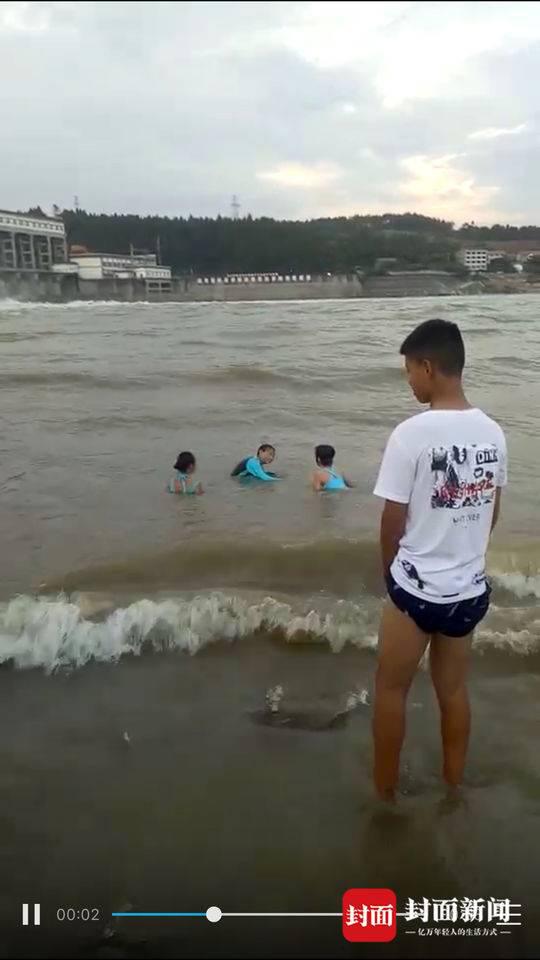 记者从目击者提供的一段视频看到,三人正蹲在水中,河面上波浪一个接着一个向岸边袭来。除熊先生的妻儿外,还有一些年青人带着小孩在水里玩耍。