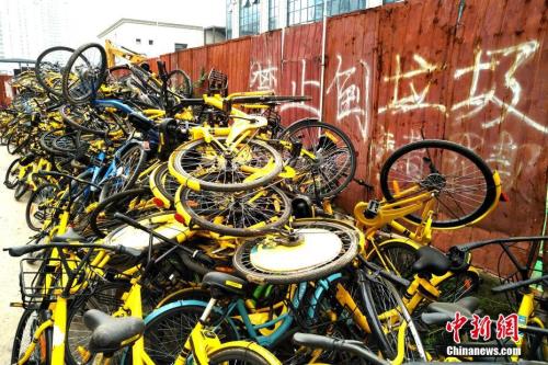 资料图 北京望京地区堆积如山的过剩共享单车。中新社记者 侯宇 摄