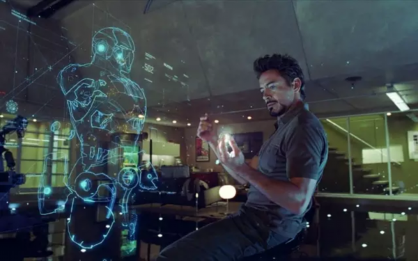 电影《钢铁侠》中,史塔克与人工智能对话,调整自身盔甲参数。