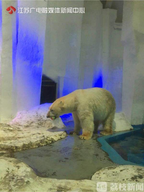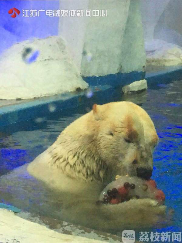 在南京海底世界,饲养员为北极熊准备了冰镇西瓜,既健胃又消食,同时,还把葡萄、苹果、西红柿、黄瓜等不同颜色的果蔬制作成果蔬冰激凌给北极熊作为避暑玩具。饲养员李阳介绍:“南京海底世界北极熊是本馆吉祥物,名叫仔仔,我们每天需要准备一些冰块和水果蔬菜投放到北极熊的生活区域,帮助它凉爽度夏,这也给游客们带来欢乐”。