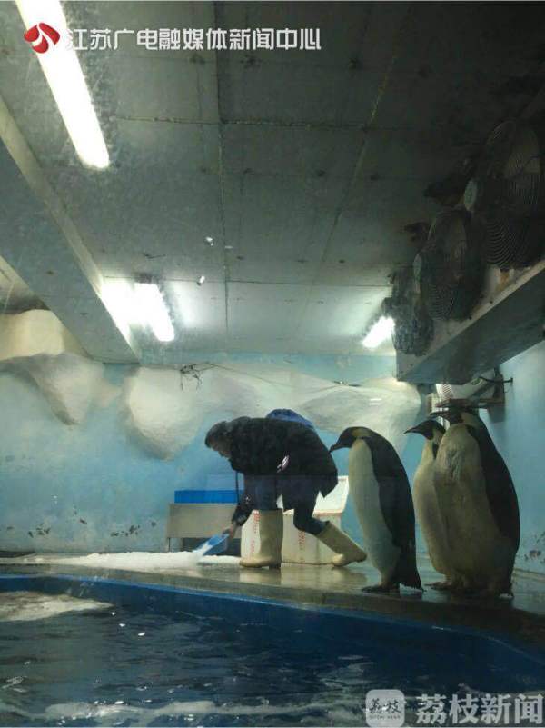李阳告诉记者:“为了给帝企鹅营造类似在北极的生活环境,我们每天定时为他们铺冰降温,还有2台制冷空调在24小时不间断制冷,保证企鹅展馆整个夏季的室内温度在零下2度左右,同时将水温控制在5摄氏度。”