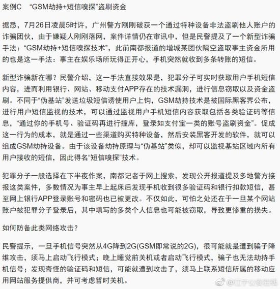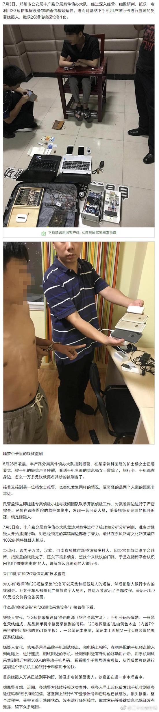 这种犯罪手法是近两年来出现的新型伪基站犯罪手段。多地警方已经有所发现(图三四五)。不同于传统的伪基站只给你发诈骗短信的方法,这种新型手法的原理是基本上如图三所示,实现不接触目标手机而获得目标手机所接收到的验证短信的目的。而更危险的新技术则是重新定向手机信号,同时使用GSM中间人方法劫持验证短信,此类劫持和嗅探并不仅限于GSM手机,包括LTE,CDMA类的4G手机也会受到相应威胁。此技术在2016年后逐步被诈骗等黑色产业注意到并迅速将其用于实际操作。