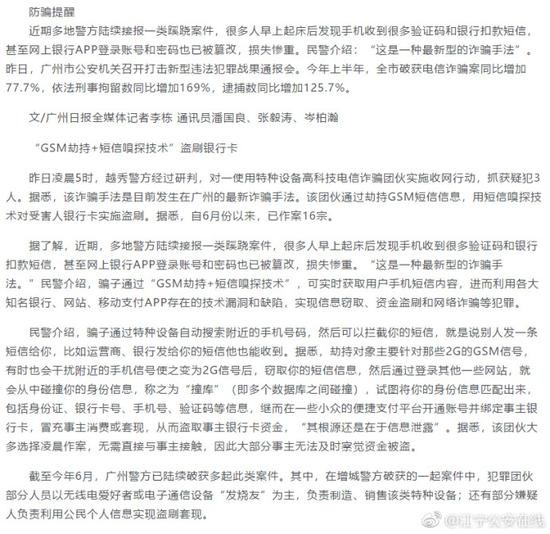 必须要说明的是,此类新型伪基站诈骗使用的方法是钻了手机信号协议的空子,对于普通用户来说基本上是无法防范的,也给警方的侦破工作带来了很大的挑战,因为涉及到的网站APP银行极其众多。