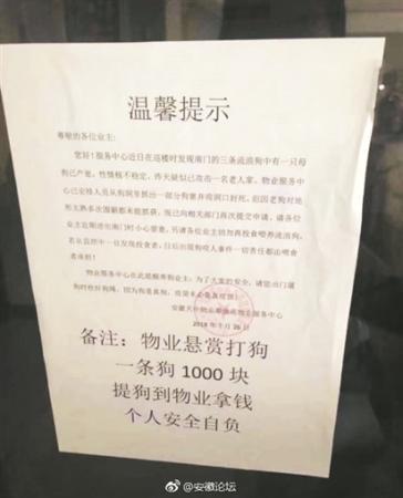 合肥一小区物业高价悬赏伤人流浪狗引争议