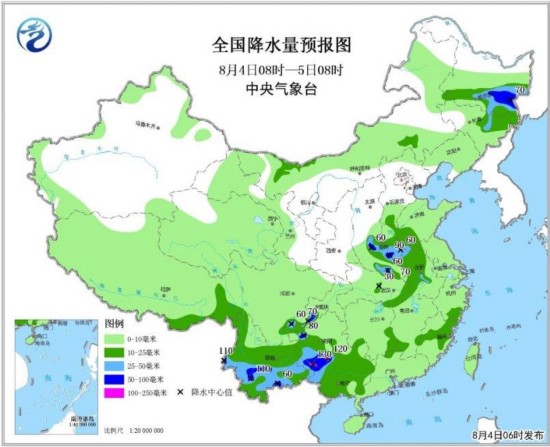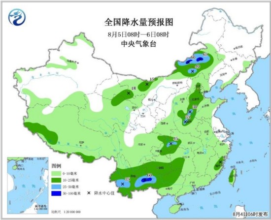 全国降水量预报图(8月4日08时-5日08时)